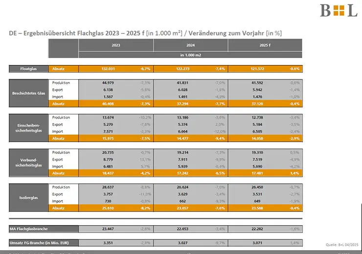 29 апреля 2025 года Немецкая ассоциация производителей листового стекла (BF) и Ассоциация производителей окон и фасадов (VFF) провели совместный семинар на тему «Статистика и рынки». Выставка проводится два раза в год и, как обычно, публикует данные о рынке листового стекла Германии за прошлый год и последний прогноз на этот год.